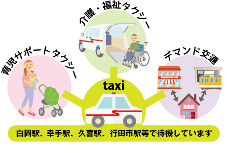| 対応 | 育児サポートタクシー、介護・福祉タクシー、デマンド交通、のりあい交通、自家用自動車管理業 |